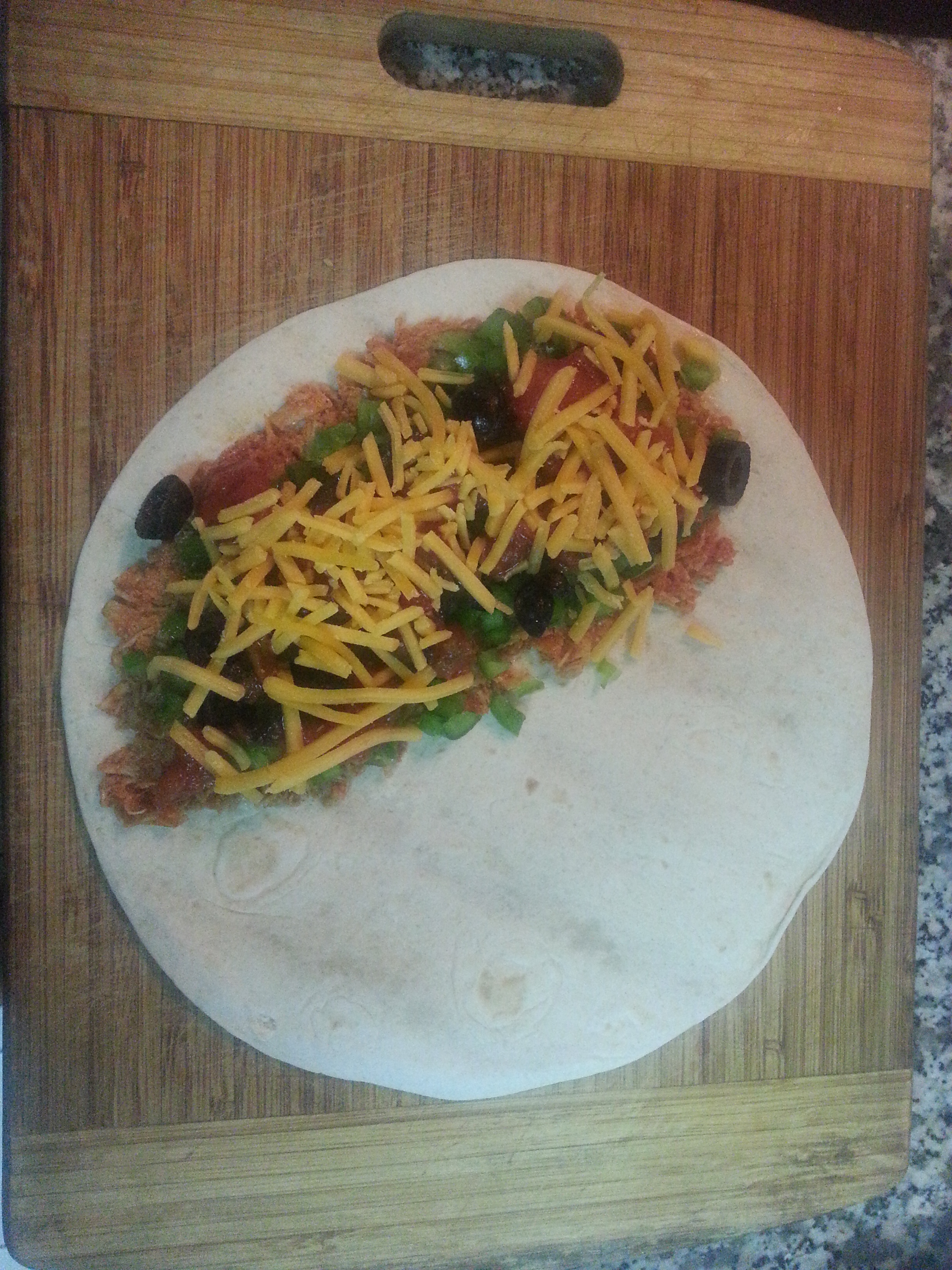 - Place the filled tortilla on the pan and let it toast for a minute. Low heat is essential here. The tortillas are already cooked. You do not want to burn them.