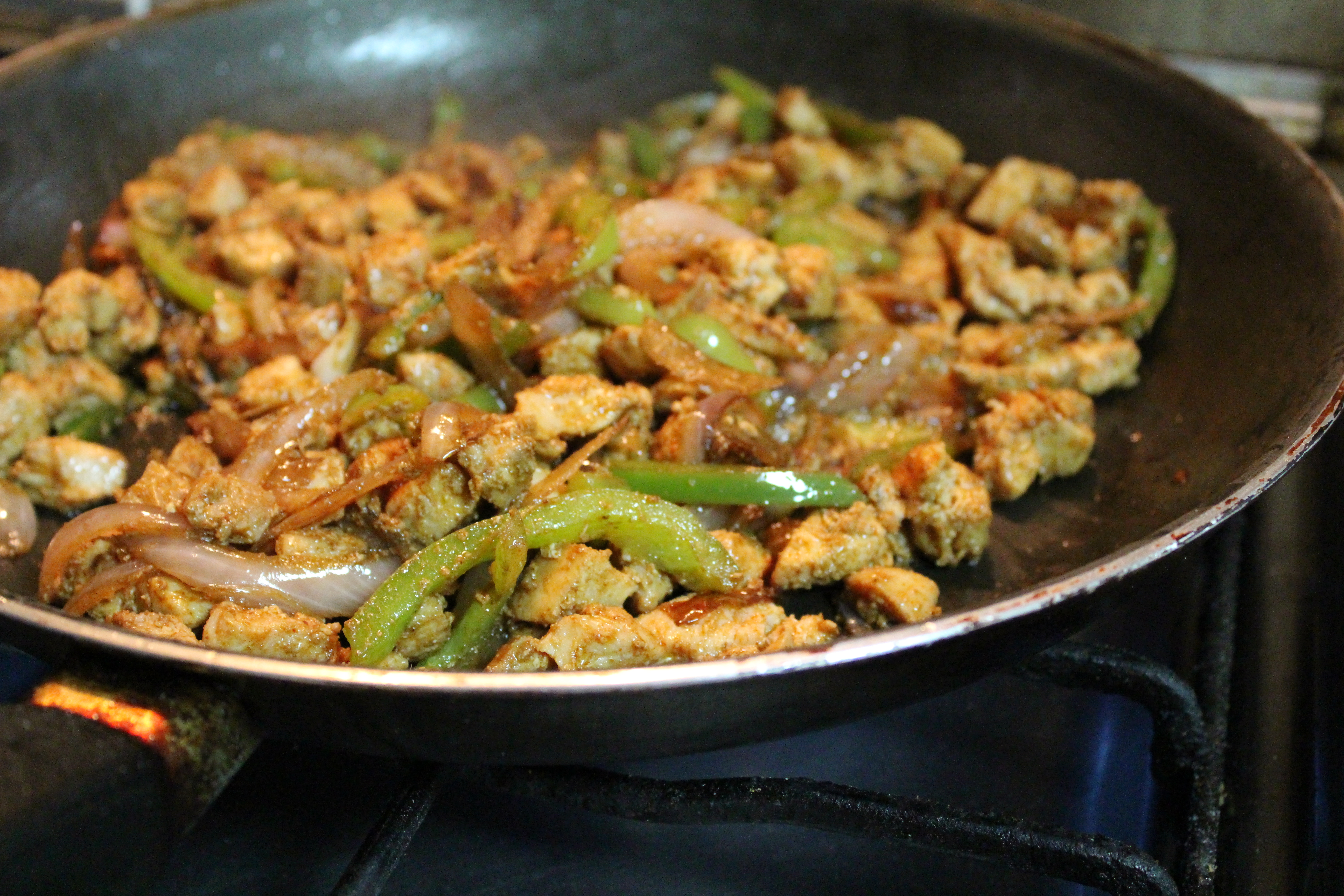 - Add the capsicum and Worcestershire sauce to the onions and cook for a minute.