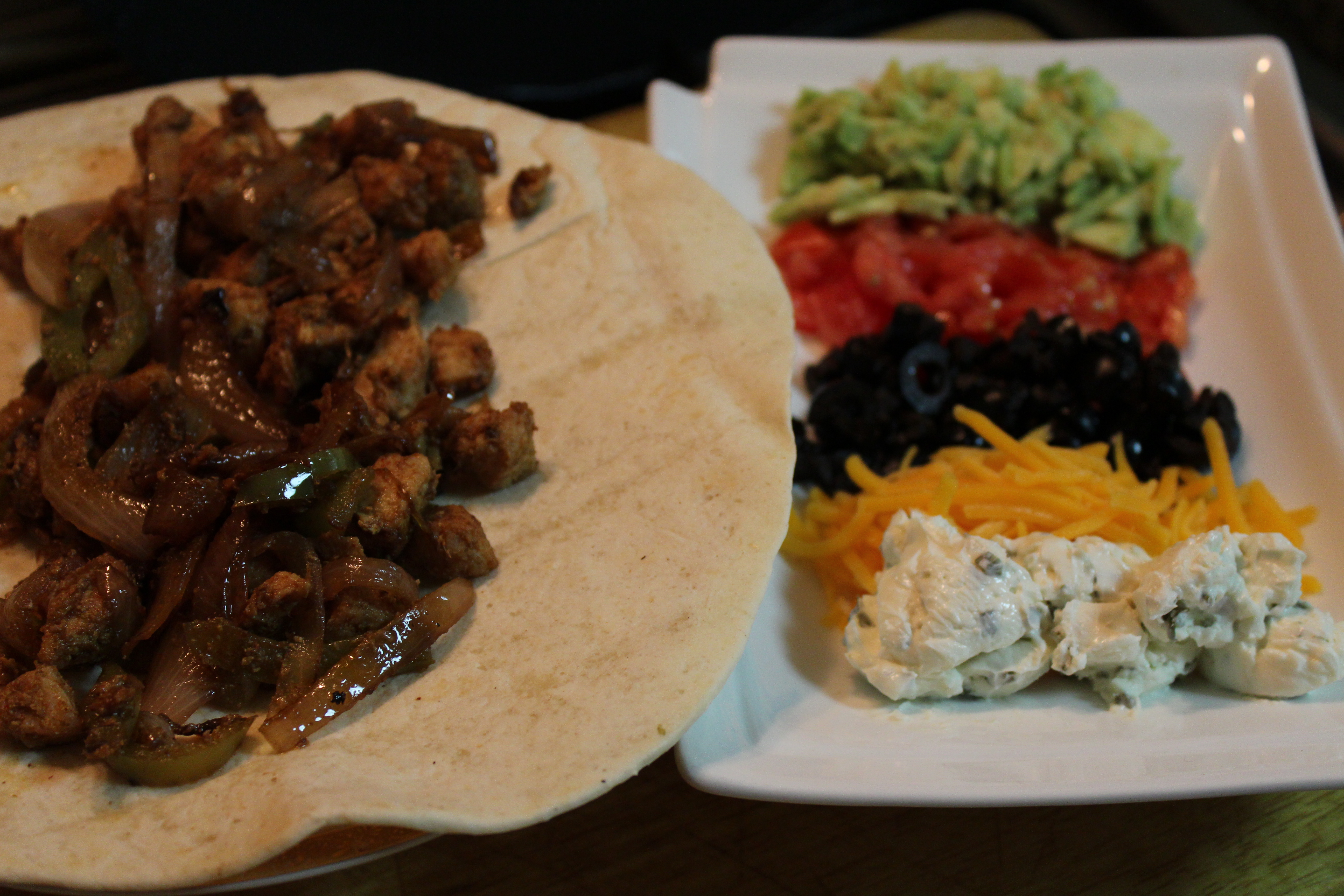 - Fill it with the chicken filling, avocado (use guacamole if you like), olives, sour cream and cheddar cheese. Wrap and serve.