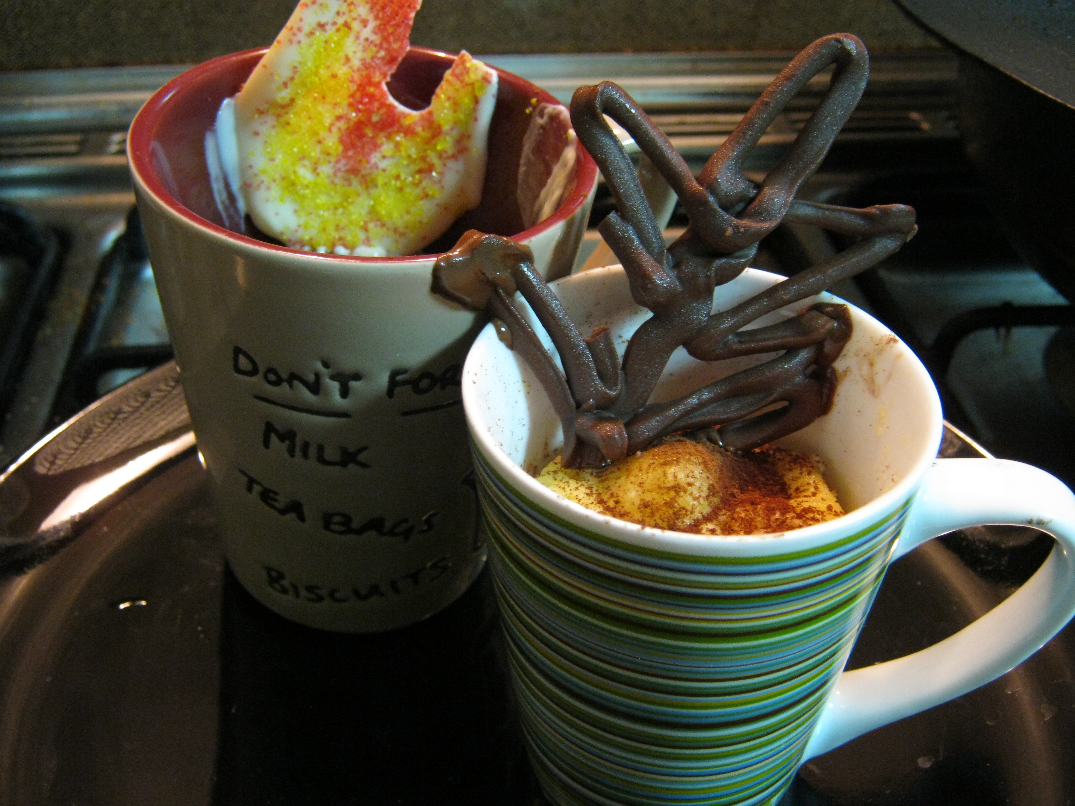 4. Divide the batter between two mugs and microwave it for two full minutes in high. The cakes usually rise, but deflate once the oven stops. If you want to avoid that, try using smaller mugs or use this recipe to make one cake mug at a time.