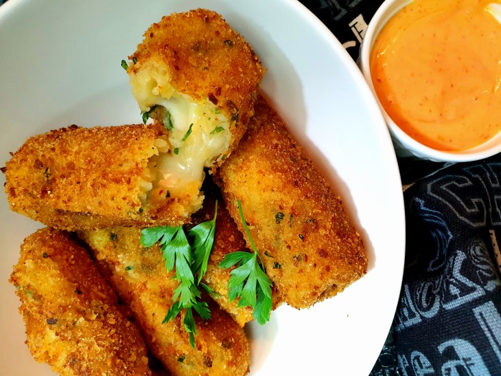 7. Dip the potato sticks(mounds) in beaten egg and coat with bread crumbs.